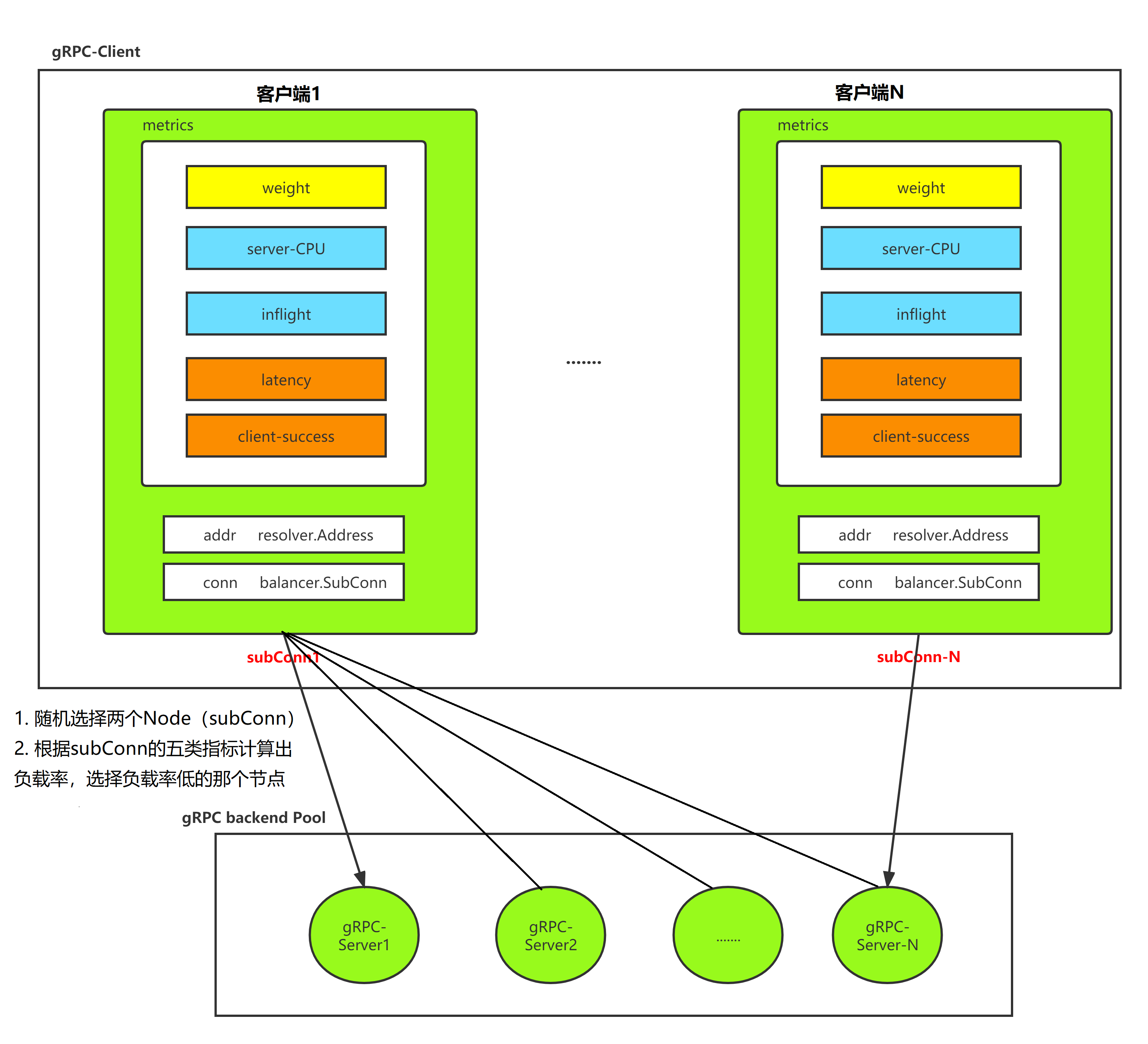 N个后端 gRPC-Server 的长连接 N个后端服务节点,初始化有一个权重值,每次调用 RPC 方法前,先根据算法打分,权重高的后端被选择用于本次 RPC 过程,那么如何调整权重值?有几个维度需要关心的- gRPC-Client 实时根据当前的后端服务端节点的负载动态调整权重:考虑服务端的 CPU(区间采样,如何消除毛刺?)、内存信息
